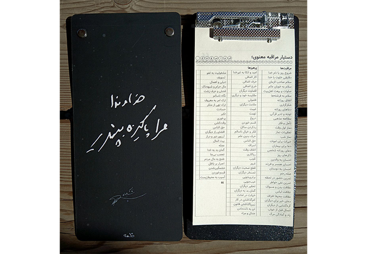 جالب اینکه حجم پرهیزها بیشتر از کارهاییست که سالک باید انجام بدهد. بعدا دیدیم که آقای بهجت هم همین نکته را گفتهاند. الگوی عملی دستیار مراقبه معنوی، همان دستورالعمل علمای اخلاق است: مشارطه و مراقبه و محاسبه. این دستیار به همراه یک تختهشاسی عرضه میشود و طرح آنها الهامگیری شده از سخنان شهید سلیمانی و شهید آوینی است.